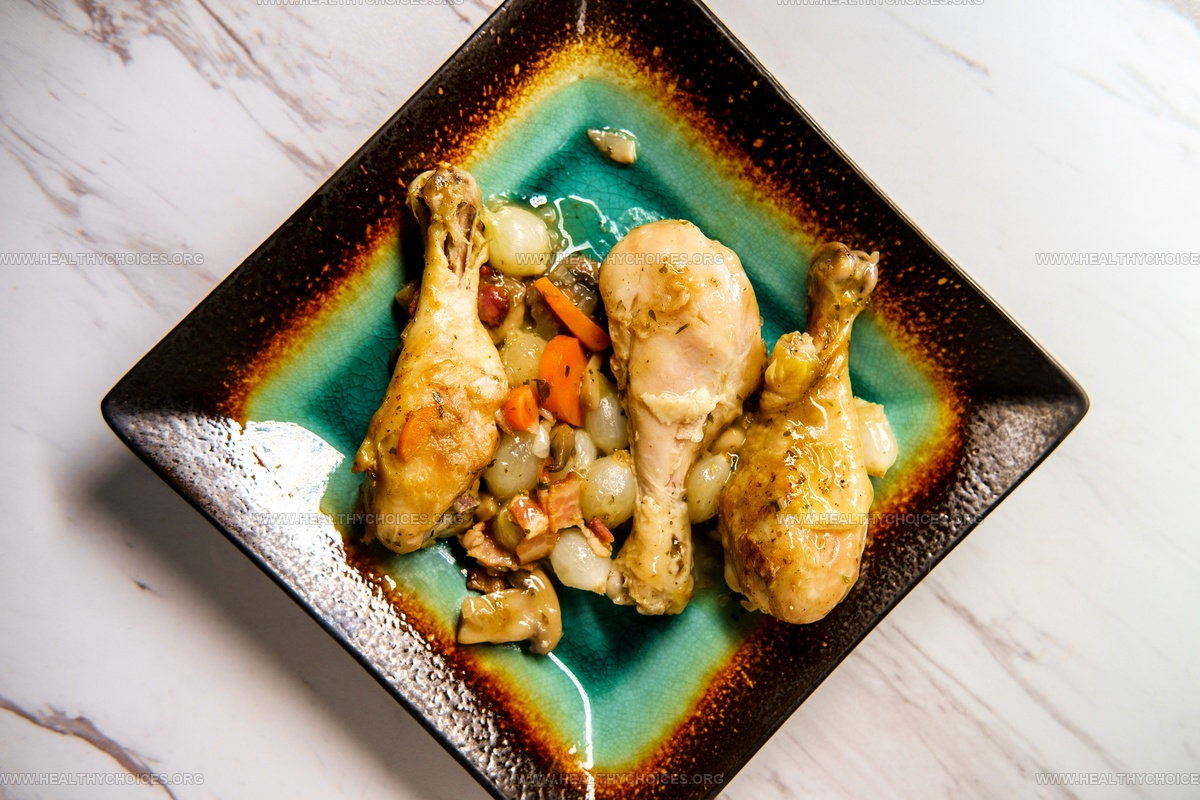 Succulent chicken simmers gently with smoky lardons, earthy mushrooms, and sweet pearl onions in a rich, velvety sauce that intensifies overnight.