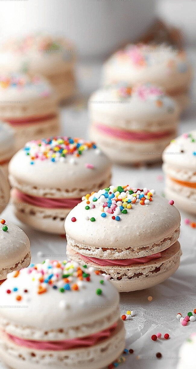 - Rainbow sprinkles add festive birthday cake vibes and delightful visual texture to your macarons.
