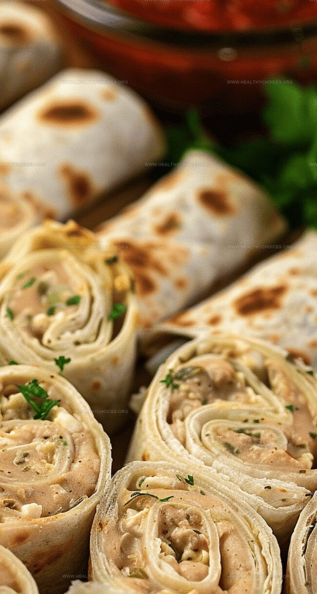Right before presenting, slice the rolled tortillas into bite-sized pieces, creating elegant round sections perfect for easy nibbling and dipping into fresh salsa.