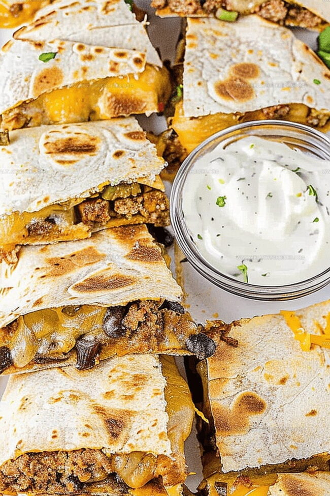 - Layering: Spread the seasoned meat mixture evenly across the tortilla base, generously top with cheese and sliced green onions, then cover with a final tortilla.
