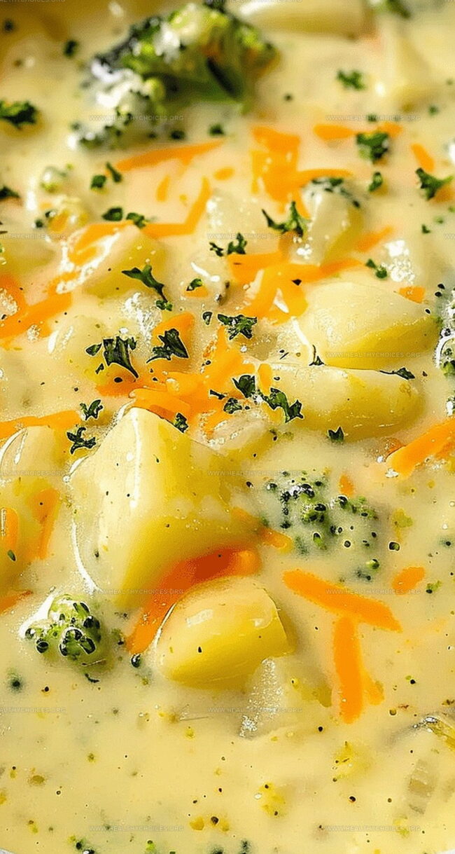 This chowder blends tender potatoes with vibrant green broccoli florets in a luxurious cheese-infused base.