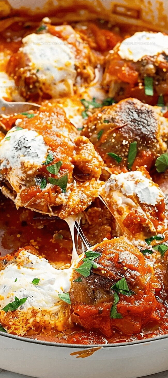 Nestle the perfectly seared meatballs into a rich marinara sauce, allowing them to simmer and absorb the tomato’s bright flavors, then crown each with a luxurious dollop of creamy ricotta for a show-stopping presentation.