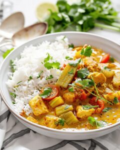 Delightful vadouvan chicken curry elevates home cooking with French-Indian spice blend magic. Smoky basmati rice and tender chicken create a luxurious meal you will savor with each comforting bite.