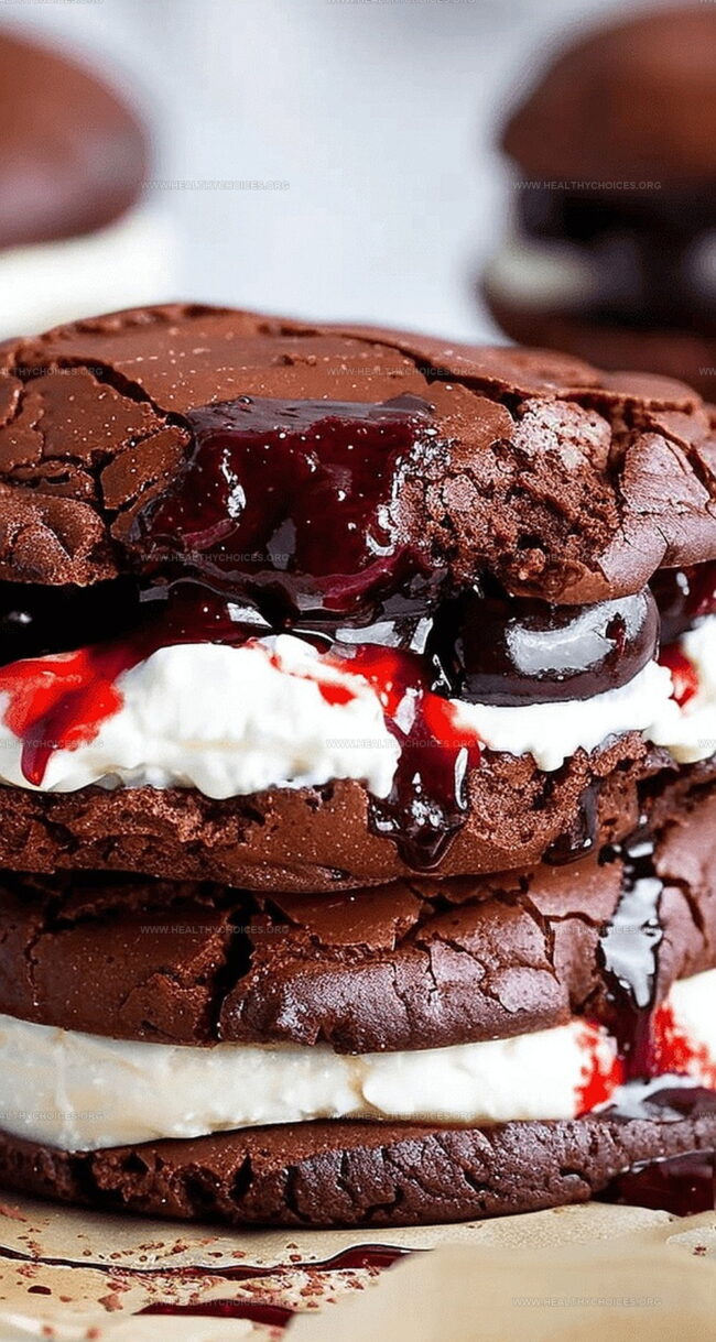 Final Composition: Construct cookies by inverting base, piping cream generously, and spooning cherry compote over the surface. Crown with a second cookie for a fully assembled delicacy.