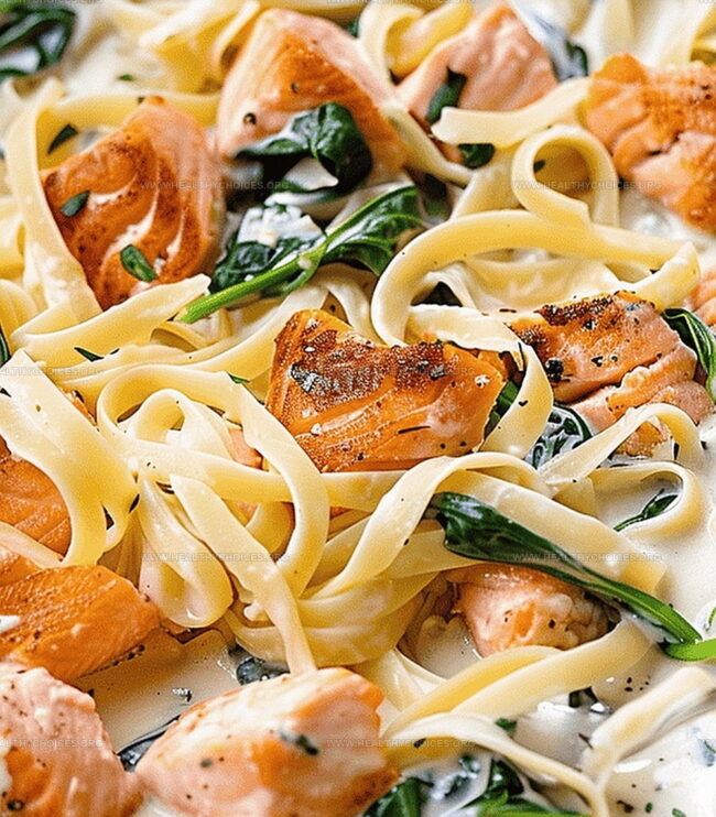 Rich, velvety sauce coats perfectly cooked pasta while tender salmon flakes effortlessly throughout each delectable bite.