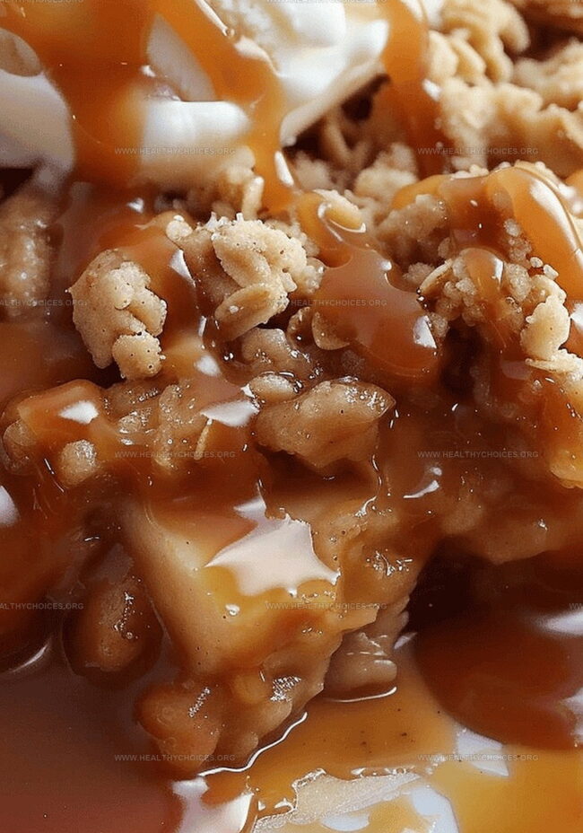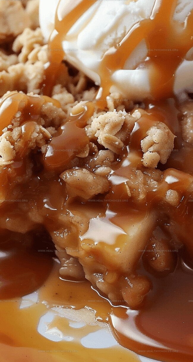 Cozy Dessert Night Companion: Pair this warm caramel apple crisp with soft vanilla bean ice cream for a delightful temperature contrast that melts beautifully on top.
