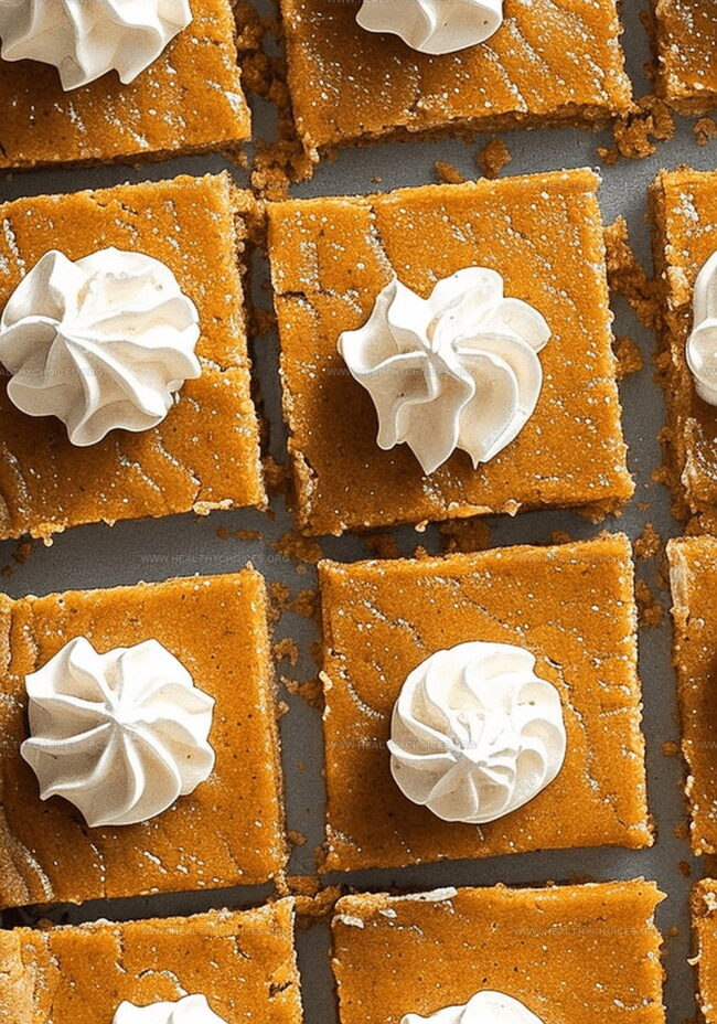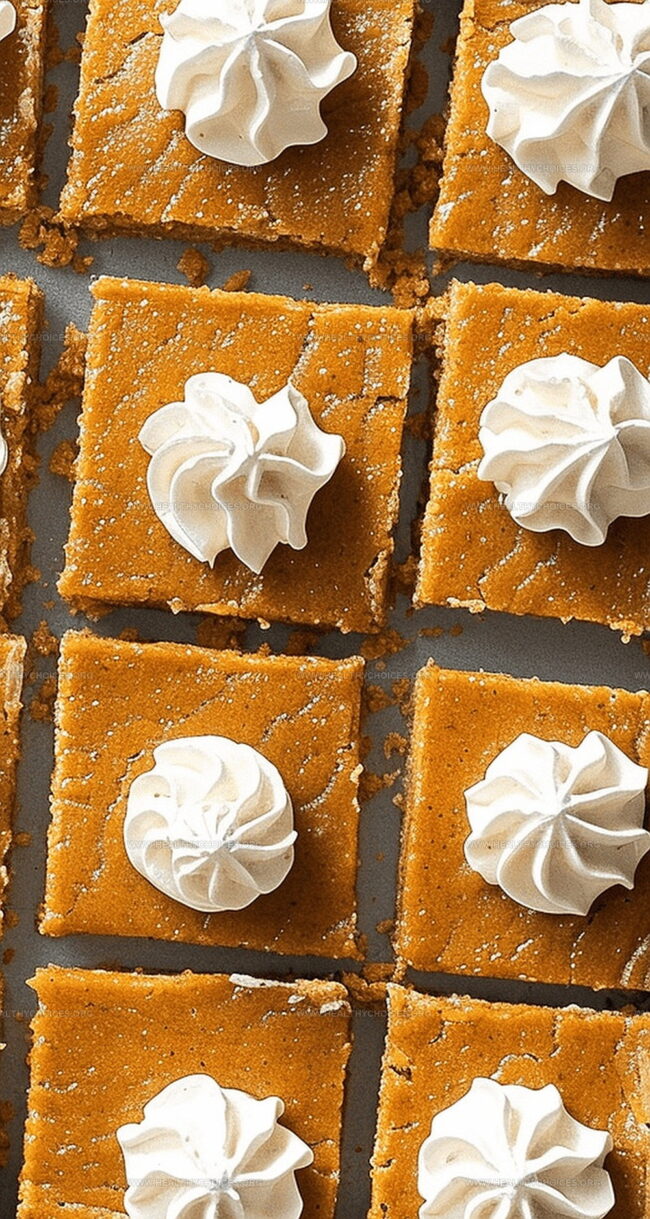 - Cooling and Finishing: Remove from oven and allow bars to cool at room temperature for 45-60 minutes. Refrigerate for a minimum of 3 hours or overnight. Before serving, prepare whipped cream by beating heavy cream and powdered sugar until firm peaks form. Slice chilled bars, top with whipped cream, and dust with a light sprinkle of nutmeg.