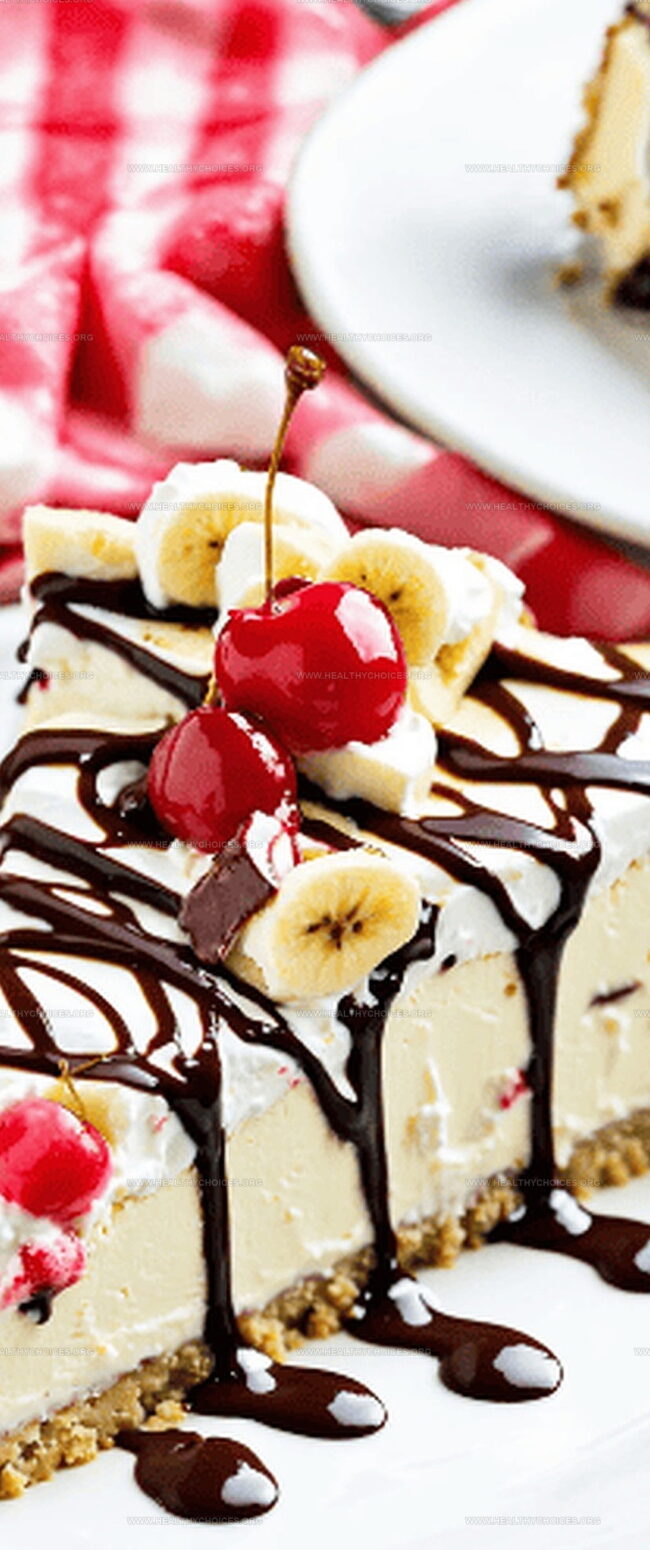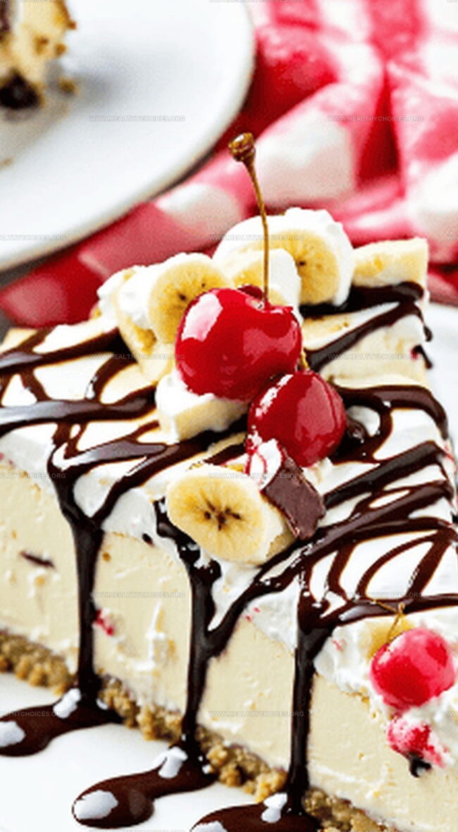 Unleash your inner artist by drizzling rich chocolate sauce in playful zigzag patterns. Crown the pie with vibrant maraschino cherries for that classic banana split charm.