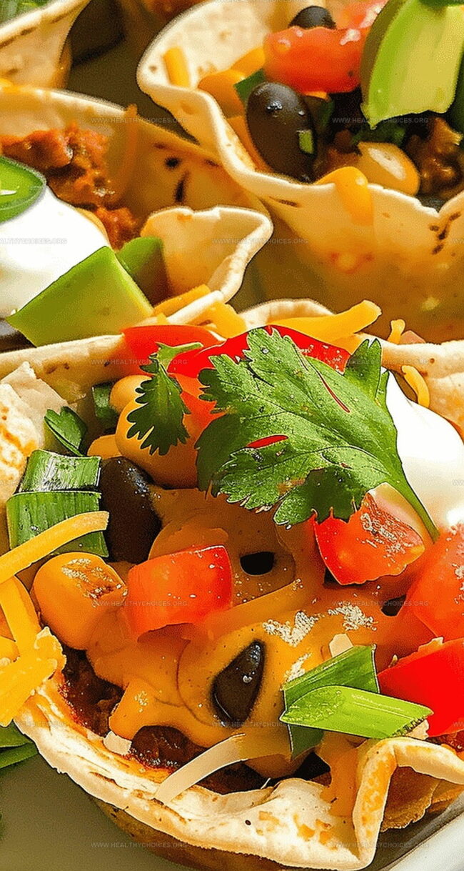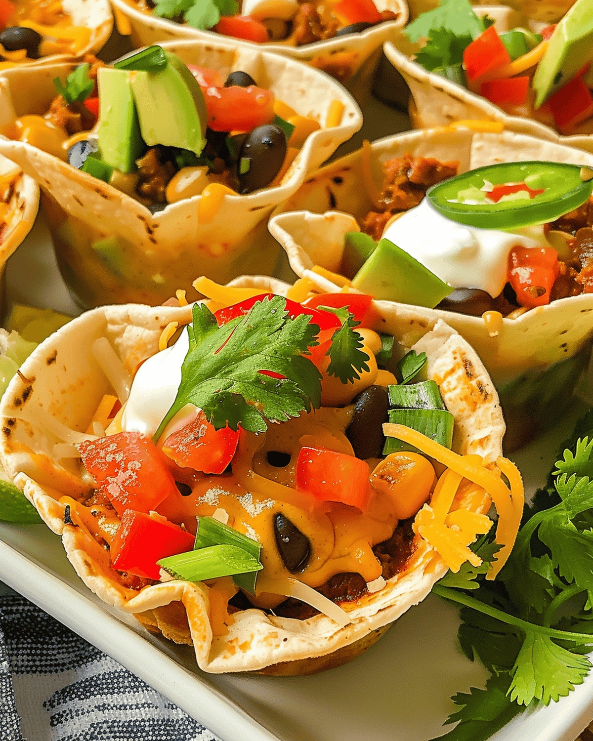 Create crispy tortilla bowls by gently pressing them into a muffin tin, giving them a perfect curved shape that cradles the delicious filling.