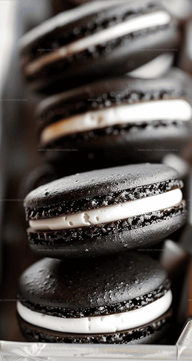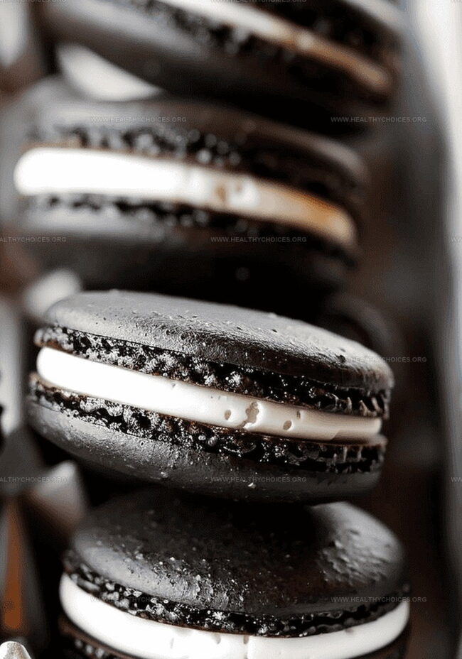 - Black cocoa powder and gel food coloring create the deep Oreo-like black color, transforming classic macarons into a cookie-inspired treat.