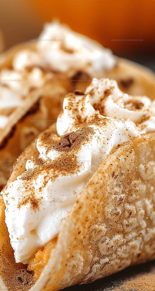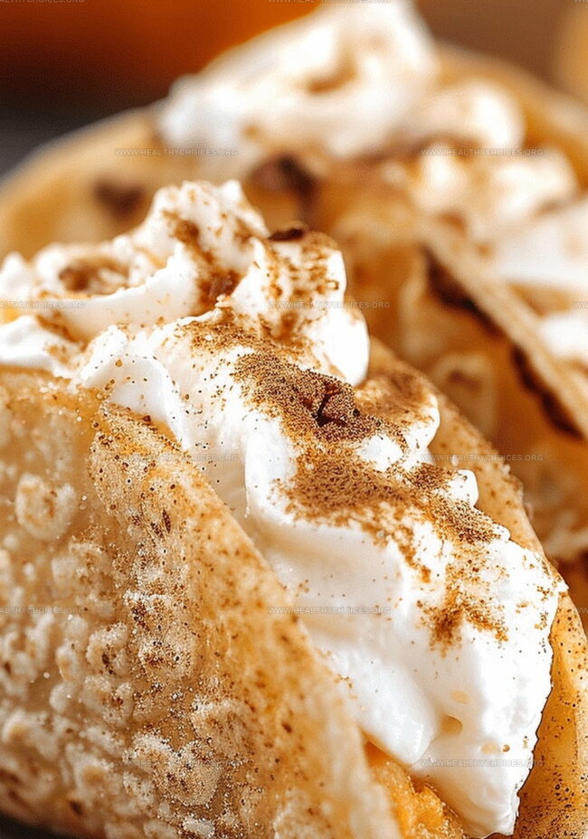 Present these festive pumpkin pie tacos immediately. Savor the delightful blend of crispy shells, creamy filling, and sweet memories!