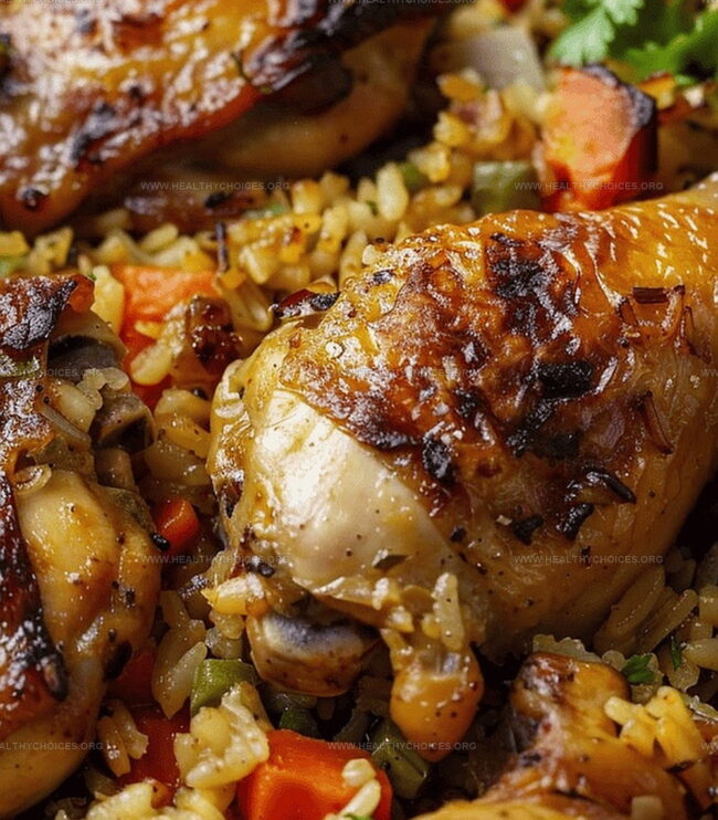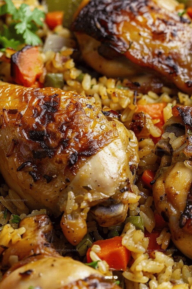 Tender chicken pieces nestle among perfectly cooked grains, infusing each bite with rich, bold seasonings.