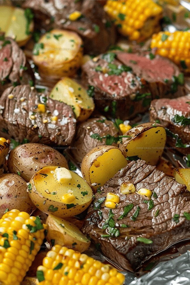 Baby Yukon Potatoes, Mini Corn on the Cob, Onions, Garlic: Vibrant vegetables that bring earthy sweetness, freshness, and depth to the packet, select firm potatoes with smooth skin and bright yellow corn for optimal taste.
