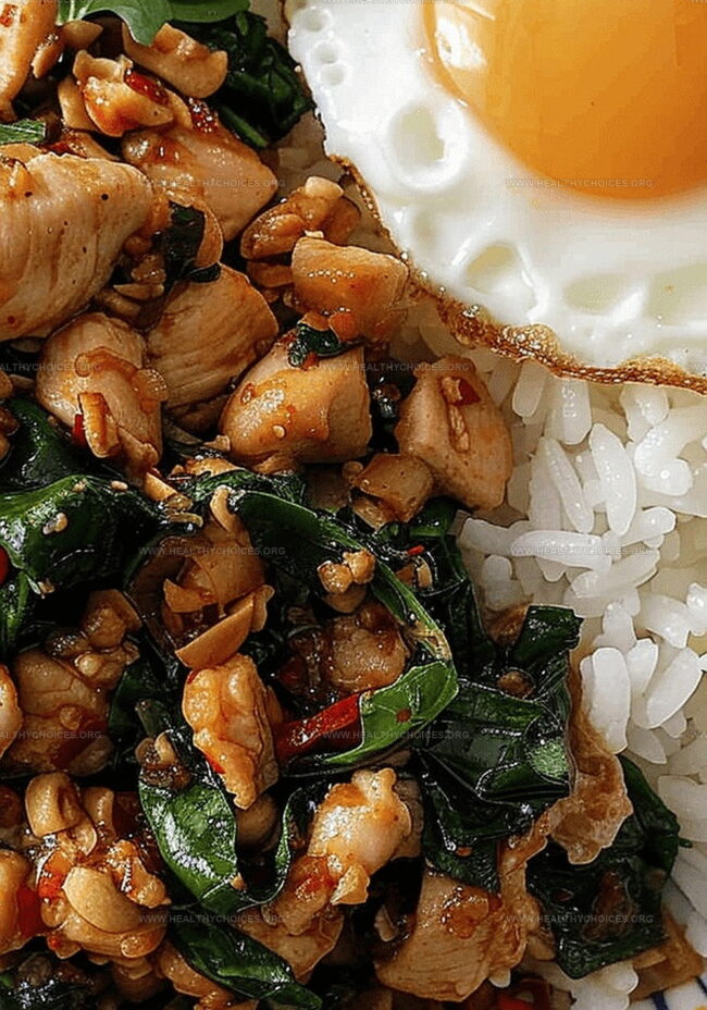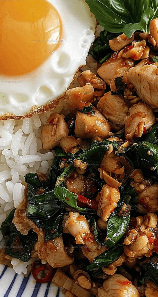 - Present the spicy basil chicken atop a pristine bed of steamed jasmine rice, crowning the dish with a crispy fried egg for textural contrast.