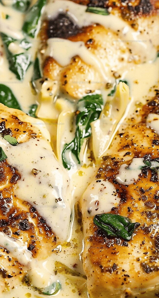 Protein:Cooking Fats:Herbs and Spices:Sauce Ingredients:Vegetable Components:Garnish:Skillet Cooking Instructions for Spinach Artichoke Chicken