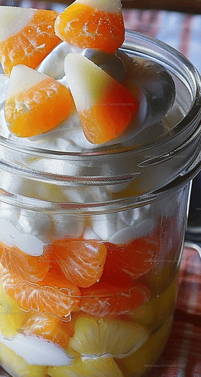 Top the fruit layers with a billowy cloud of whipped cream, mimicking the signature white peak of classic candy corn and transforming the dessert into a playful seasonal delight.