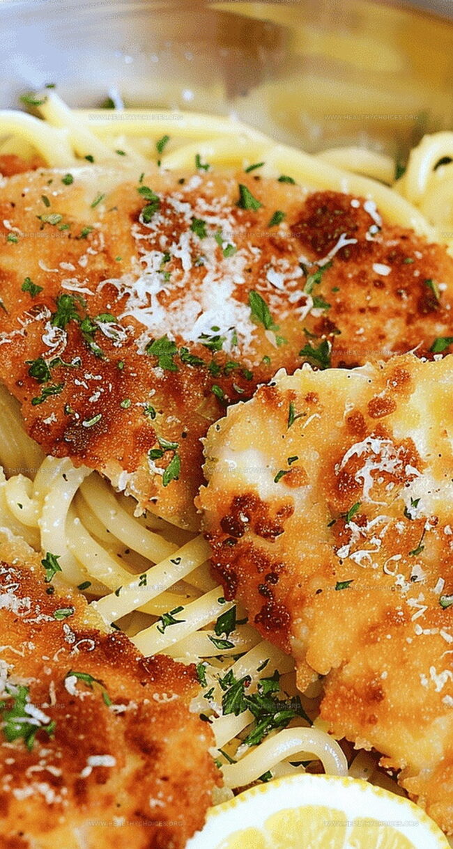 Elegant Dinner Presentation: Layer the golden Romano chicken atop the creamy lemon garlic pasta for a restaurant-style plating that impresses guests and elevates the dining experience.