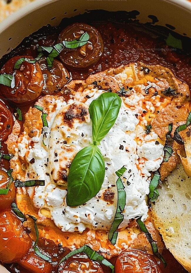 - Cheese Placement: Shape goat cheese into a flattened disc slightly smaller than the baking dish, positioning it centrally in the sauce. Drizzle with olive oil, sprinkle thyme, kosher salt, and fresh ground pepper.