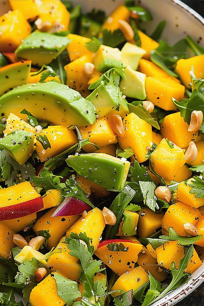 - Salad Assembly: Layer arugula in a serving dish, strategically arranging diced mango, avocado cubes, and thinly sliced red onions across the verdant base.