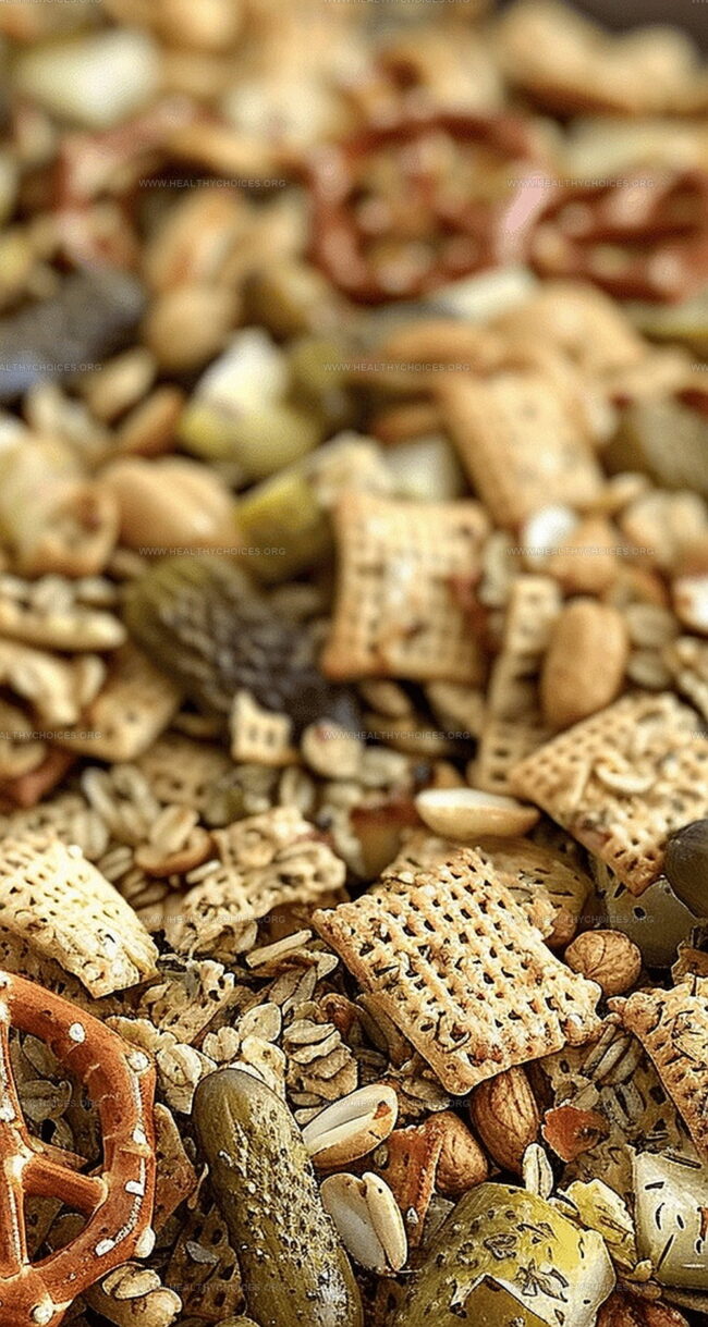 - Mixing Base: Combine Chex cereal, pretzel sticks, roasted peanuts, and dill pickle chips in a large mixing bowl, blending the dry ingredients to create a uniform foundation for the snack.